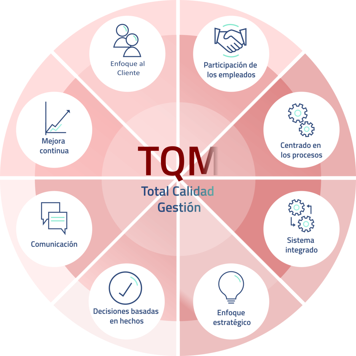 Los principios de TQM son un conjunto de enfoques de gestión que se aplican en Manufacturas Adir e integra a todos los empleados en la mejora continua. Utiliza estrategia, datos y comunicación eficiente para integrar la disciplina de calidad en la cultura y las actividades corporativas.